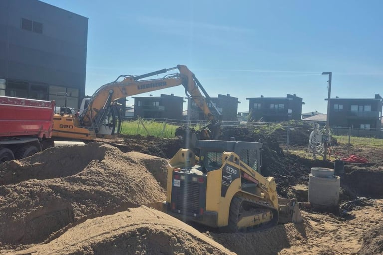 Pakeliame ir suformuojame sklypą taip, kad jis būtų paruoštas statyboms ar gerbūvio darbams. Suorganizuojame visą procesą: atvežame reikalingas birias medžiagas, suformuojame reljefą ir nuolydžius, o perteklių – išvežame. Dirbame pagal objekto grafiką, kad sekančios statybų stadijos prasidėtų be prastovų.